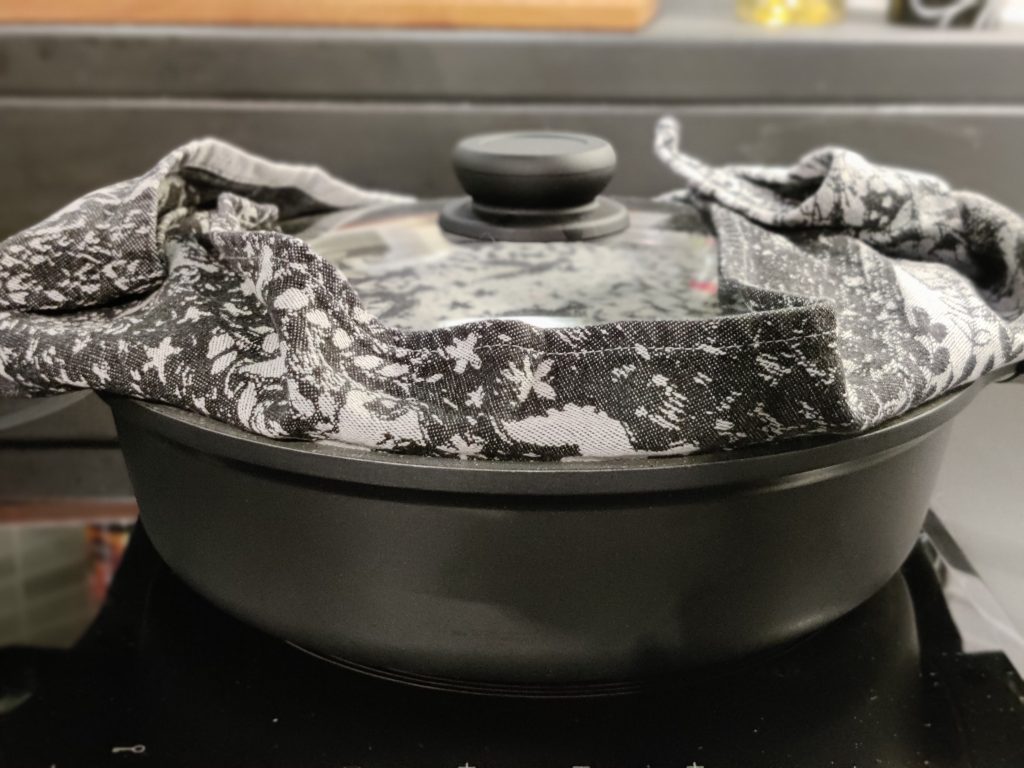 Kun vesi kiehuu, laske lämpötilaa, laita esimerkiksi keittiöpyyhe pannun päälle ja sen jälkeen laita vielä kansi pannun ja pyyhkeen päälle. Varmista, että pannu on tiukasti suljettu.