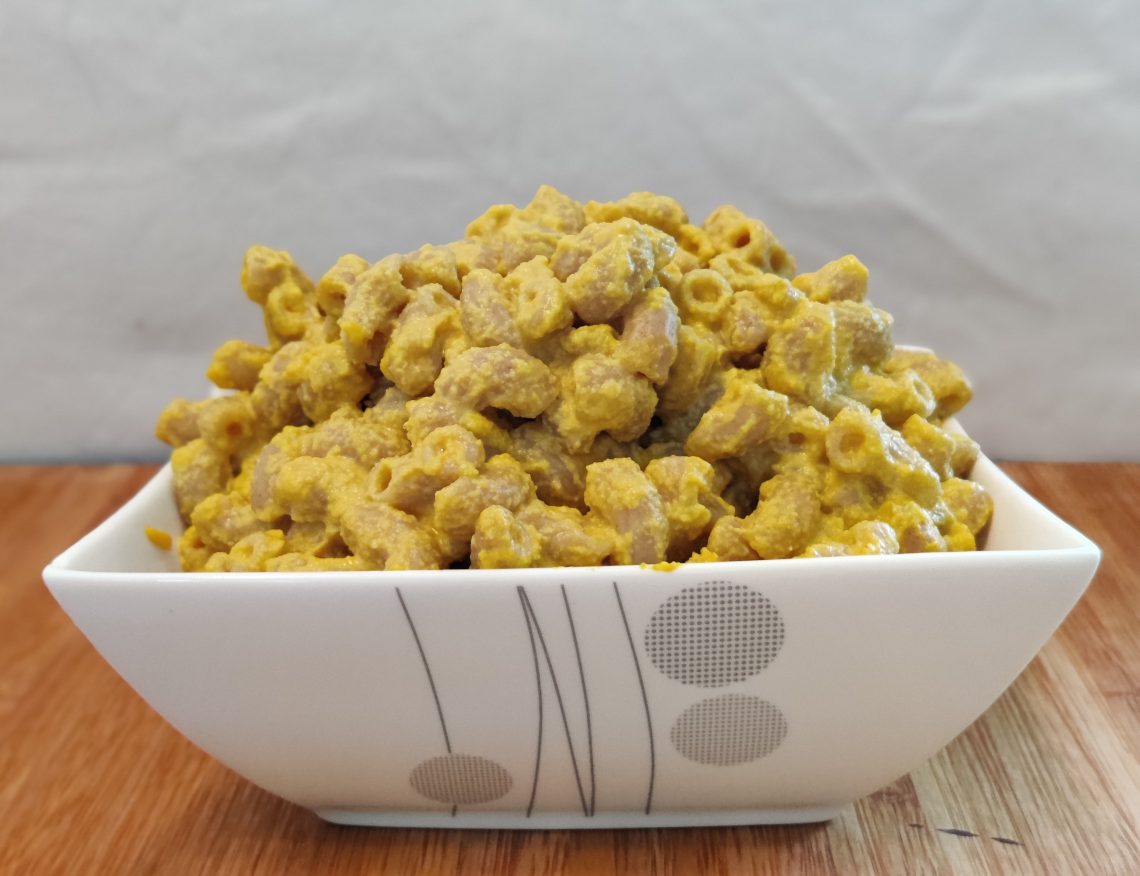 Laita tehosekoittimeen kaikki muut ainekset paitsi makaroni ja prosessoi täysin tasaiseksi tahnaksi – se vie jonkin aikaa.