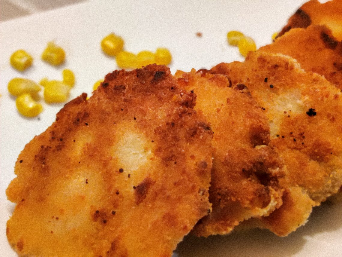 Pyörittele pihvit ensin taikinaseoksessa ja sitten korppujauhossa.