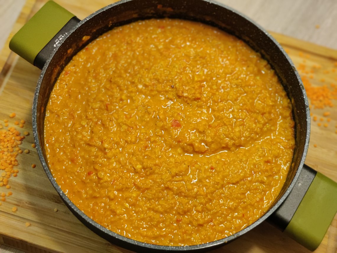 Kun linssi on pehmeää, lisää kookosmaito, sekoita ja keitä vielä 5 minuuttia.