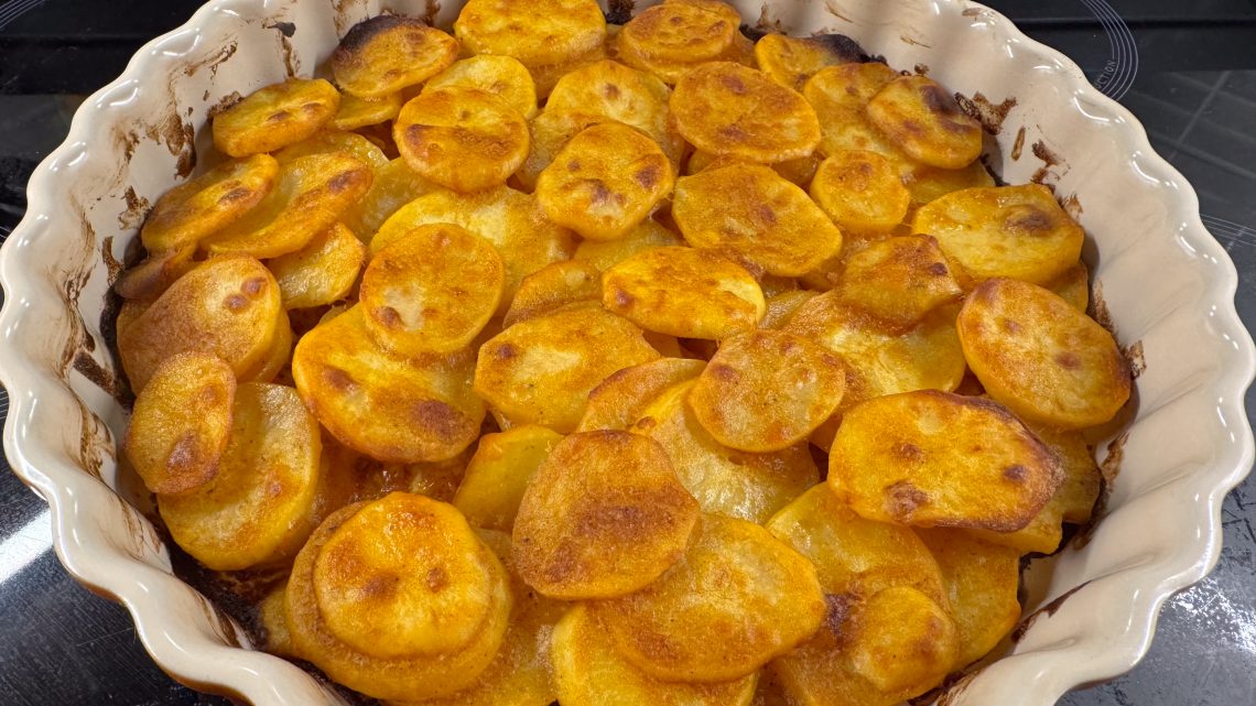 Paista uunissa 200 asteessa (ylä- ja alalämpö) noin tunnin ajan tai kunnes perunat ovat kullanruskeita.